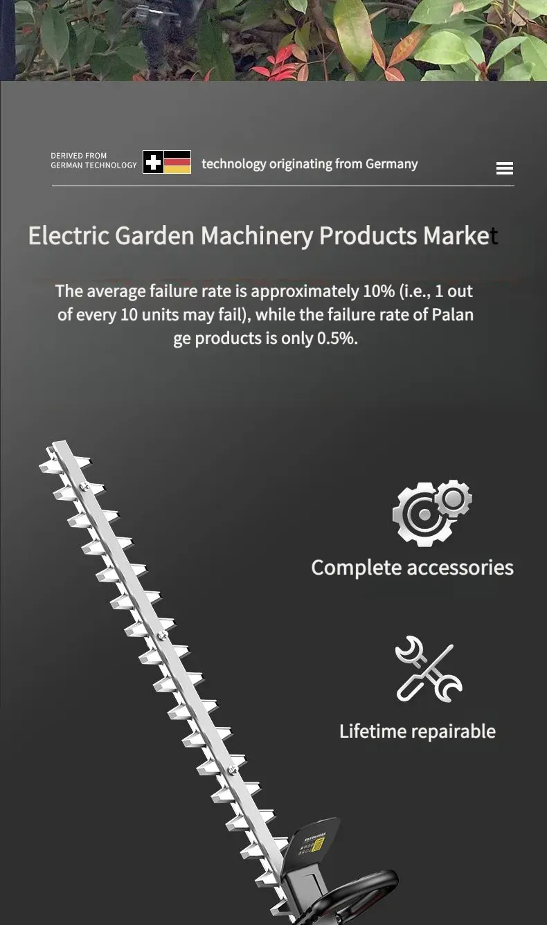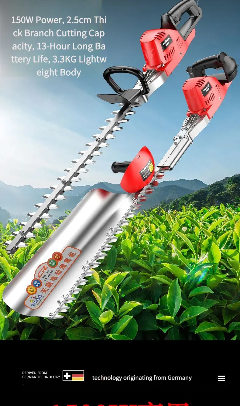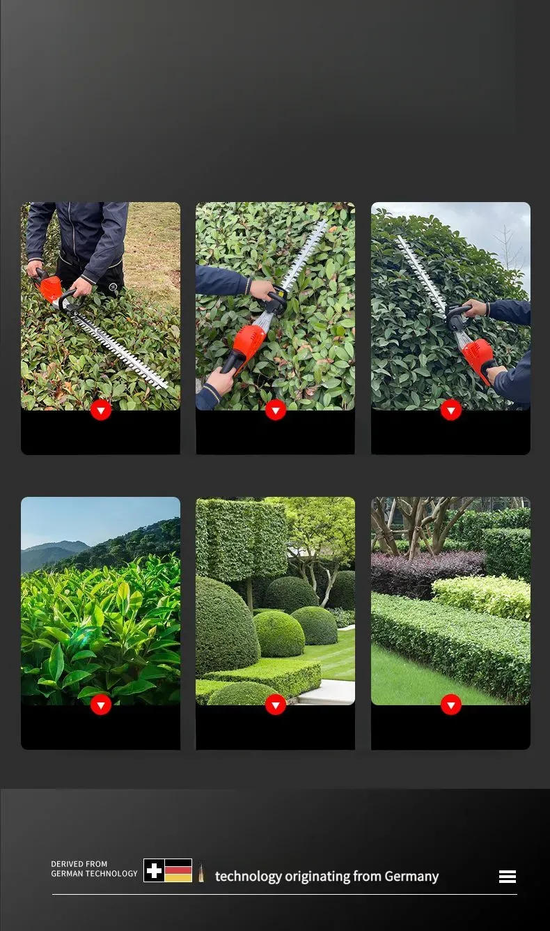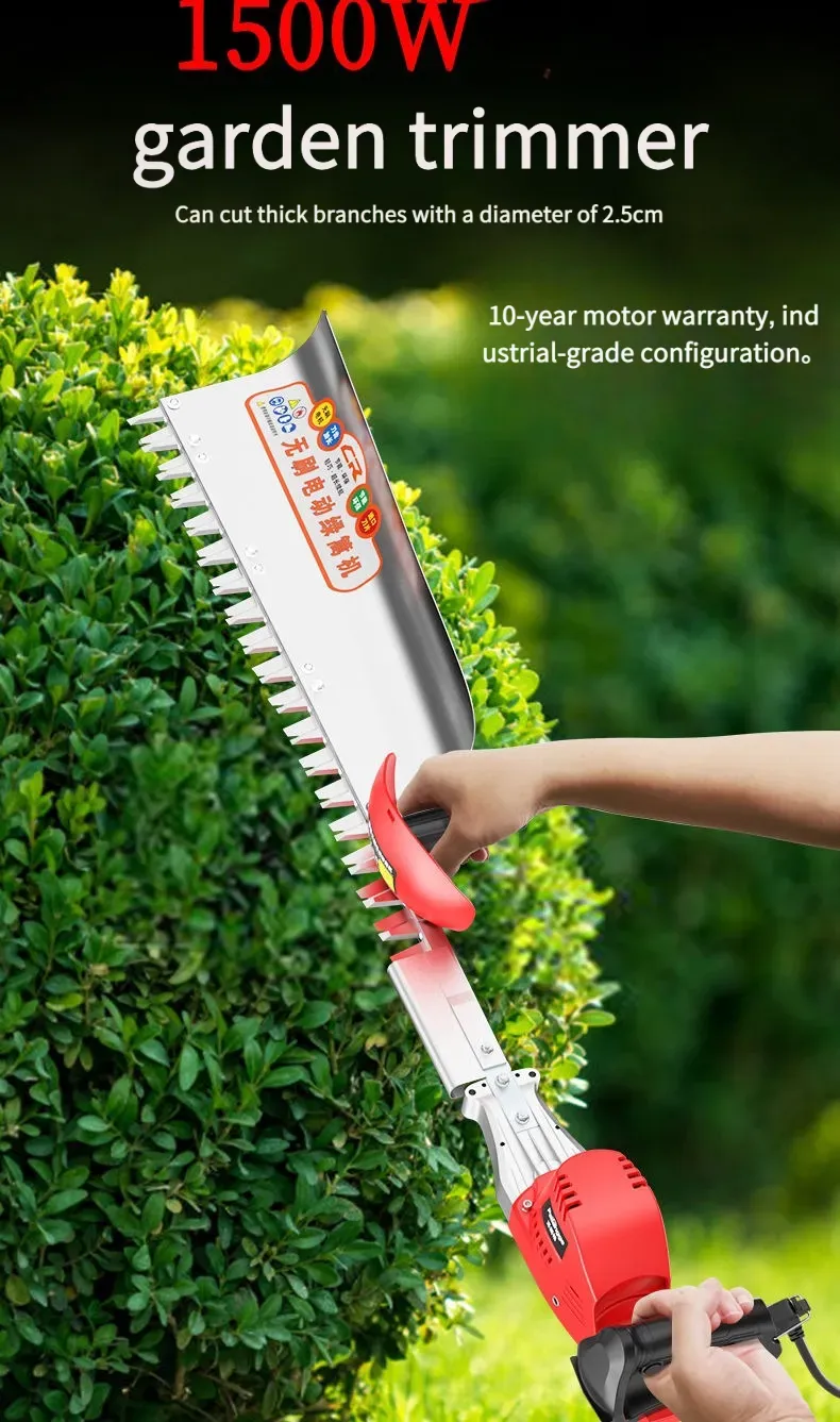 Esta podadora elétrica de alta potência para árvores e vegetação é equipada com um motor de alto desempenho, com potência nominal de até 1500 W, capaz de cortar facilmente galhos de árvores com diâmetro inferior a [X] cm. Seja para podagem diária de paisagismo verde ou para modelagem de árvores em pomares, ela consegue concluir a operação com eficiência. O corpo é projetado com combinação de plástico de engenharia de alta resistência e peças metálicas, não só leve e fácil de transportar, mas também com excelente desempenho de resistência a quedas e desgaste, adaptando-se a ambientes de trabalho complexos ao ar livre. Além disso, ela é equipada com uma alça ergonômica, confortável para segurar, sem causar fadiga com uso prolongado, e também possui um interruptor de segurança para evitar operações acidentais, garantindo a segurança do usuário.