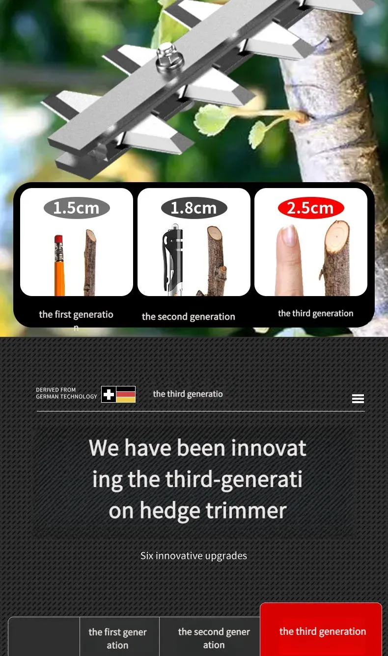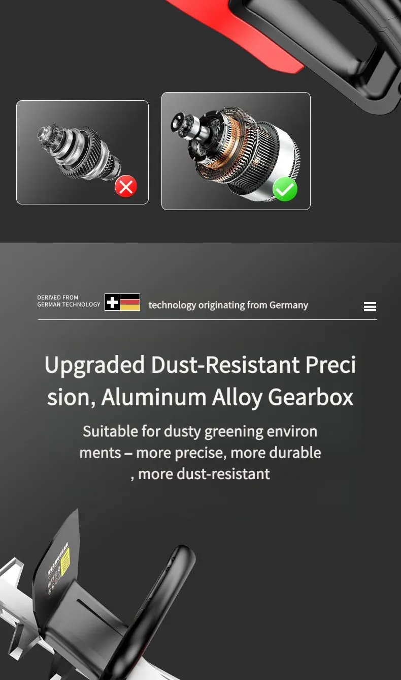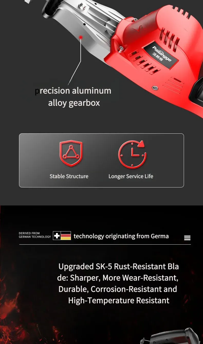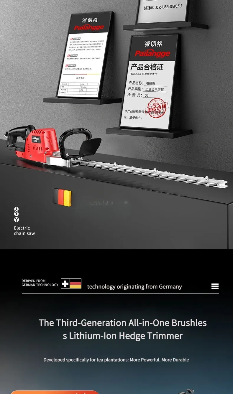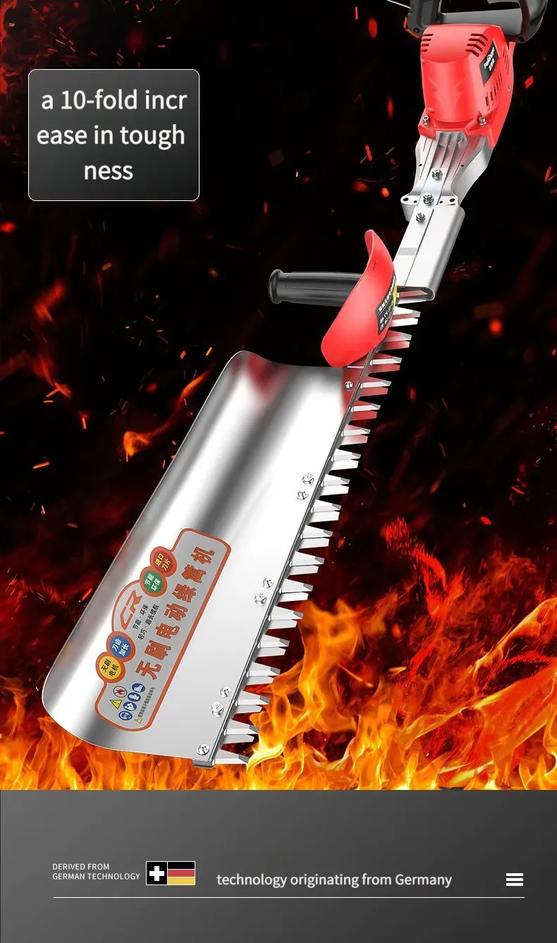Esta podadora elétrica de alta potência para árvores e vegetação é equipada com um motor de alto desempenho, com potência nominal de até 1500 W, capaz de cortar facilmente galhos de árvores com diâmetro inferior a [X] cm. Seja para podagem diária de paisagismo verde ou para modelagem de árvores em pomares, ela consegue concluir a operação com eficiência. O corpo é projetado com combinação de plástico de engenharia de alta resistência e peças metálicas, não só leve e fácil de transportar, mas também com excelente desempenho de resistência a quedas e desgaste, adaptando-se a ambientes de trabalho complexos ao ar livre. Além disso, ela é equipada com uma alça ergonômica, confortável para segurar, sem causar fadiga com uso prolongado, e também possui um interruptor de segurança para evitar operações acidentais, garantindo a segurança do usuário.